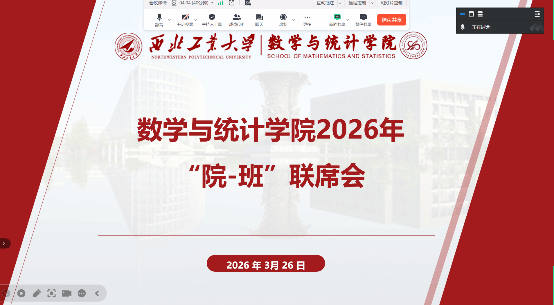 3月26日,数学与统计学院2026年“院–班”联席会在线上顺利召开。学院团委书记王晓迪出席会议,学院学生会骨干与各班班委代表齐聚一堂,围绕“合力为同学服务,打造更好的学习和生活环境”核心主题深入交流,共商服务举措。会议由学生会执行主席张梦瑶主持。