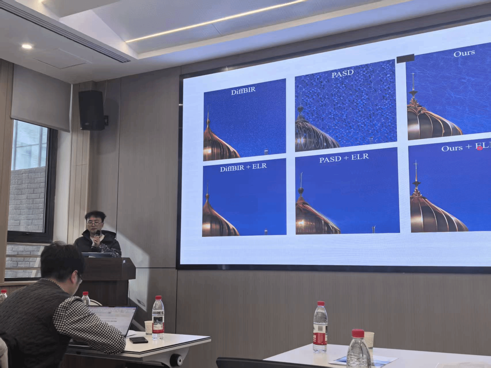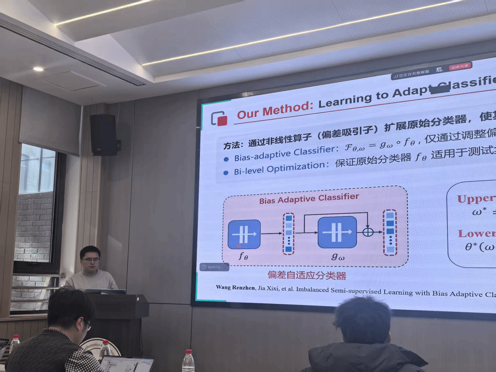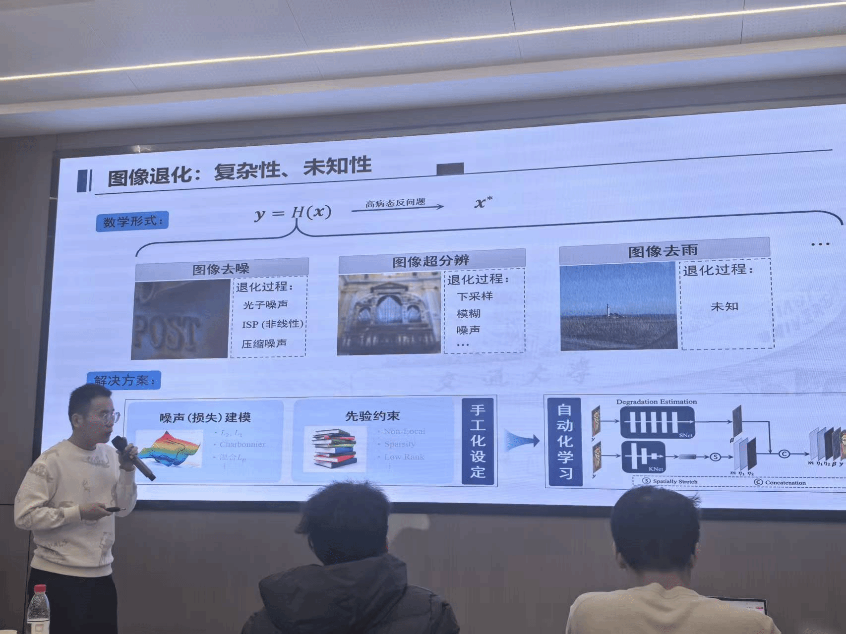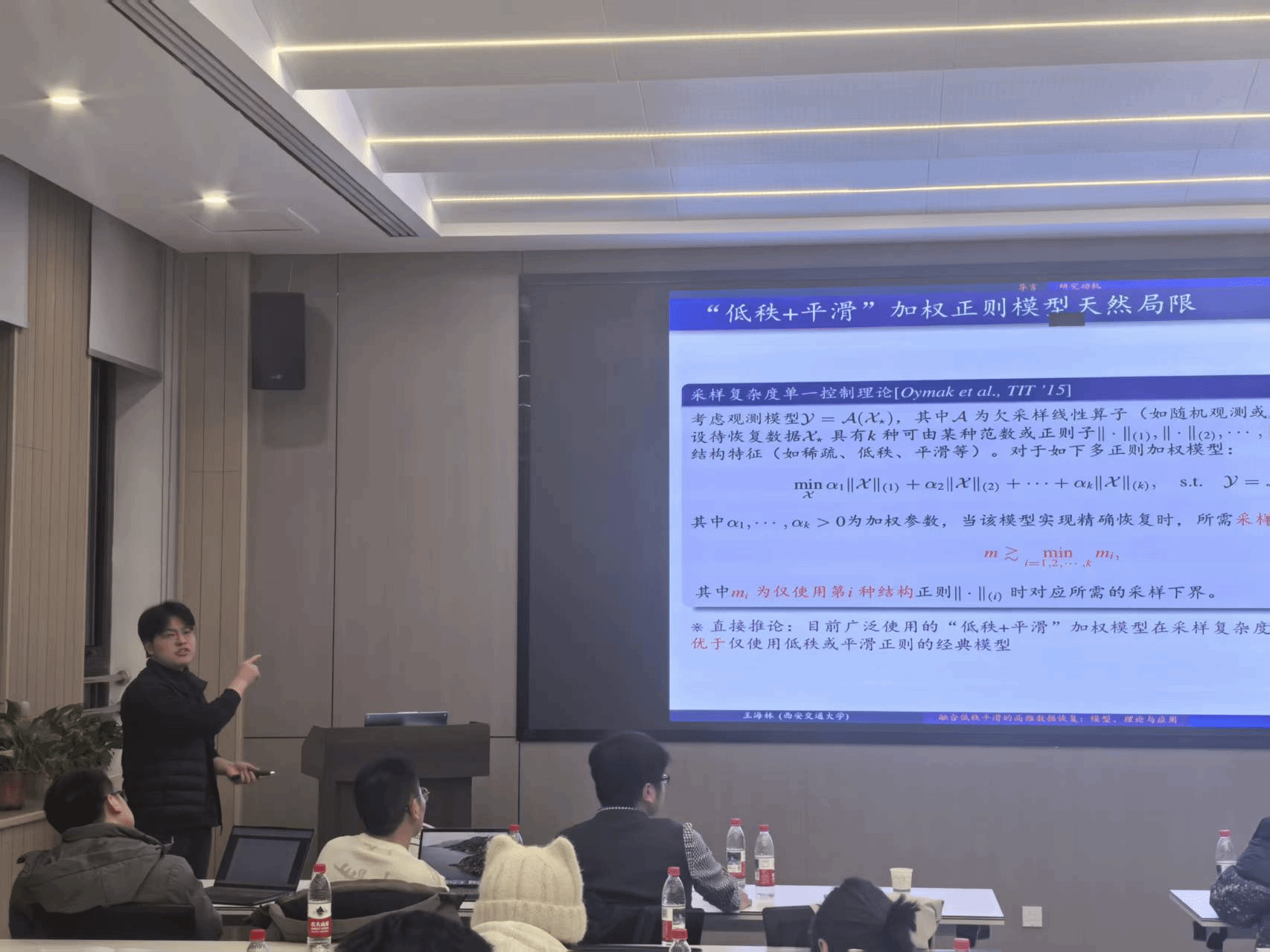 会议核心报告环节,四位专家学者带来了极具前沿性的学术分享。西北工业大学栗帅教授以“基于生成模型的真实图像超分”为题,深入探讨了语义信息引导、变分自编码迁移学习及强化学习在图像超分辨率问题中的创新应用,为解决真实场景下的图像退化难题提供了新思路;西安交通大学王仁振助理教授针对半监督学习的分布偏差问题,介绍了偏差自适应分类模型与异方差伪标签建模方法,有效提升了模型在复杂环境中的泛化性能与稳健性;西安交通大学岳宗胜教授聚焦图像复原的“自动化”与“通用化”建模,其研究成果已成功应用于华为旗舰手机影像系统,实现了技术落地与产业赋能;西安交通大学王海林博士分享了融合低秩平滑的高维数据恢复研究,提出的全新建模方法在图像视频处理、异常检测等多领域展现出优越性能。报告结束后,与会嘉宾围绕研究热点、技术难点展开深入研讨,形成了多项建设性共识。